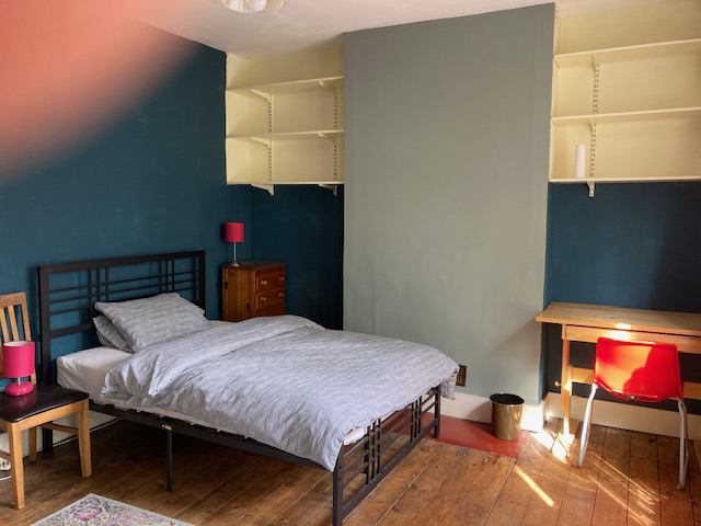 The room is fully furnished with double bed, wardrobe, clothes’ rail, chest of drawers and desk with chair and lamp.