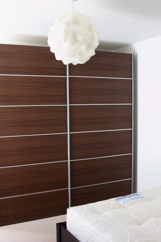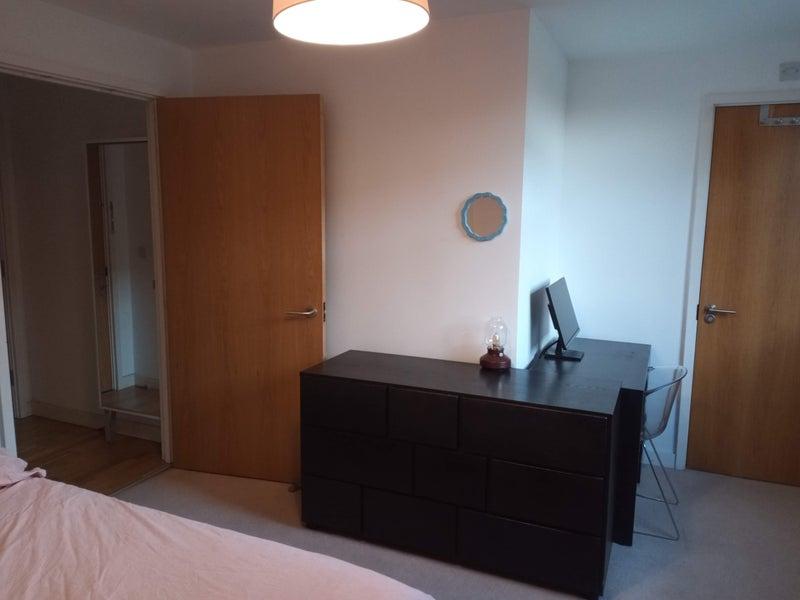 A lovely en-suite double room with a large wardrobe, chest-of-drawers, desk and chair.