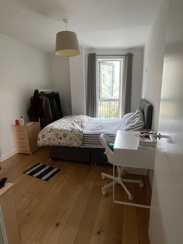 The room comes with a bed, side tables, and a wardrobe, and there’s plenty of storage space around the flat. Bills aren’t included.