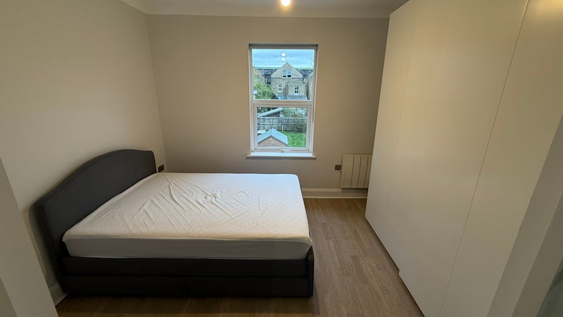 Part-furnished; a double bed with mattress and an IKEA PAX wardrobe bespokely made for the room (sofa and bookshelf in the photos are staged and will be removed).