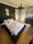 Newly refurbished and modern large double room, with new black faux leather bed, memory foam mattress, all new bedding. Black glass/mirror slider robes to one wall, large window with black/blackout blind, black chandelier, wood floor and ample storage, central heating and mood lighting. New ensuite bathroom, black and chrome with large wet room style shower, heated towel rail and storage. Private Road with ample parking, in quiet cul-de-sac. Short walk to Tadworth Station and busses. Unlimited WiFi.