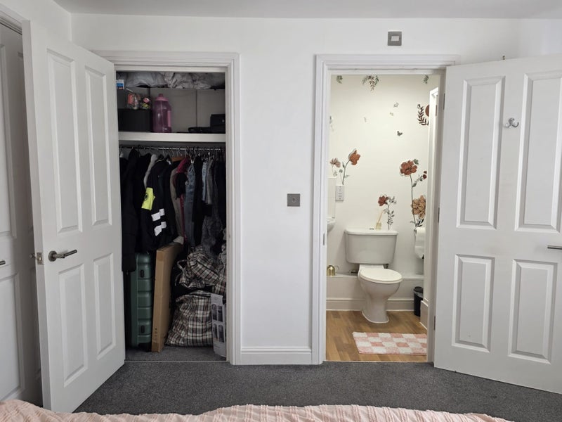 Double room available in a relaxed, friendly flat in the Surbiton/Kingston area. The room is unfurnished so you can make it your own, and comes with a private en-suite (shower + toilet) and built-in wardrobe, your own self-contained space within the flat. There's also a small balcony accessible from the living room.