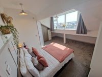 The large furnished double bedroom is on the top floor at the rear of the house overlooking the garden. It has a spacious modern en-suite with shower, basin and toilet. The bedroom has a beautiful panelled feature wall and comes with a double bed, built in wardrobe and bedside table.