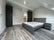 The flat features a stunning open-plan kitchen and living area, where large electric Velux windows flood the space with natural light, creating a bright and airy atmosphere.