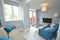 Communal living room with sofas, TV and French doors leading to the rear patio garden.