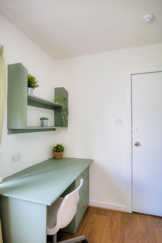 The double bedroom is on the 1st floor at the rear of the house overlooking the garden. It has a gorgeous green feature wall and laminate wood flooring. The room comes with a double bed, wardrobe and built in desk and drawers.