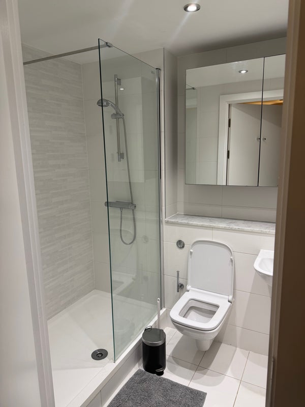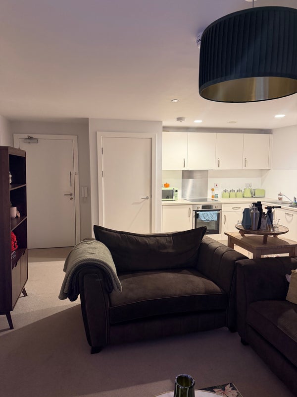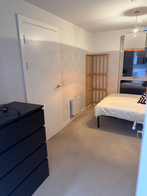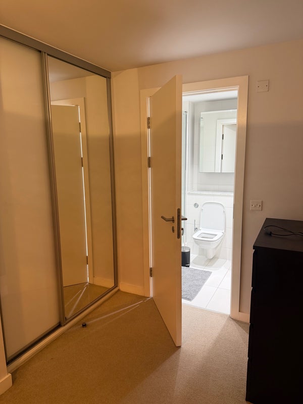 Double en-suite room, shared living room and kitchen area, balcony. Free gym in complex, cinema room can be booked free of charge, parking available on site (extra fee). Living with a single professional female.