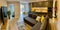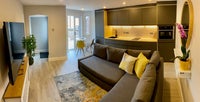 LIVING ROOM/KITCHEN: A modern space that comes finished to a very high standard. The lounge offers a corner sofa which pulls as a king size bed; wall mounted 50” smart TV and shelf storage. The kitchen is fully fitted with oven, hob, integrated fridge/freezer, dishwasher and washing machine. There is also a table in chairs in front of the patio doors, ideal for dining or home working. Sunny south facing patio doors!