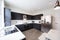 Modern kitchen with dishwasher, washer drier, 5 ring gas hob, American style fridge freezer, and dining table and chairs