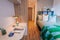 Private bedroom with a small double bed, desk, chair, mirror, and double wardrobe.
