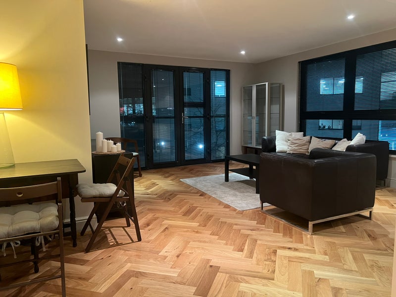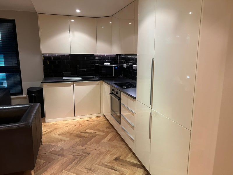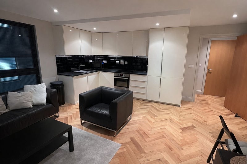 The room itself is furnished with a comfortable double bed, stylish desk, built-in sliding mirror wardrobe, and fitted blinds for added privacy. The Juliet balcony in the living area allows plenty of natural light, and the apartment is situated on the 2nd floor of a secure, well-maintained building.
