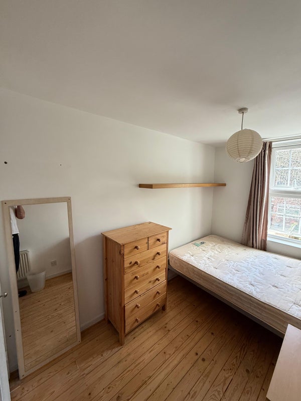 A lovely double room is available in a four-bedroom end-of-terrace house. The room has a double bed, wardrobe, chest of drawers, sash double-glazed windows, shelves and a large mirror. The house and room are fully furnished with all mod cons, including TV, unlimited wireless internet access, polished wooden floors throughout, etc. Furthermore, the house has an easy-maintenance garden, two showers/bathrooms, three separate WCs, a large kitchen with a dining table, and a large lounge with new leather sofas. Currently, the house has three professional females in their 30s/40s living there.