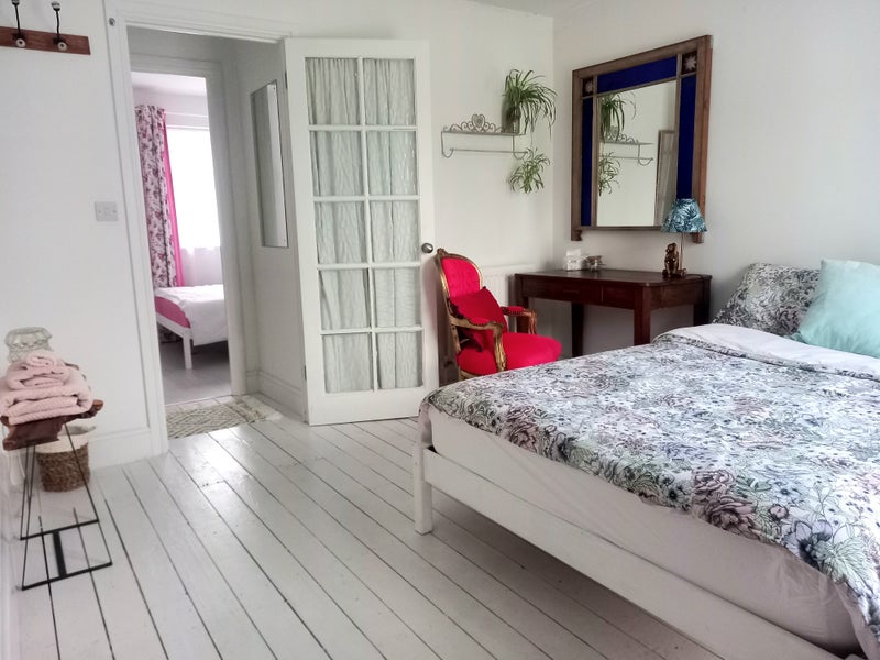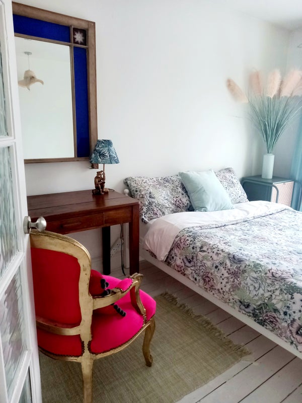 The room, just like the rest of the house, is very bright and minimalist. Clothe hanging space, and plenty of drawers. Tall window overlooking the garden. However spacious, it wouldn't be suitable for a person with lots of belongings.