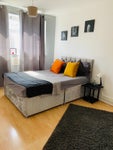The flat benefits from excellent transport links, providing very easy access to Central London. This spacious master bedroom is part of a beautifully refurbished property, finished to a high standard and ideal for professionals looking for comfort and convenience in a vibrant area.