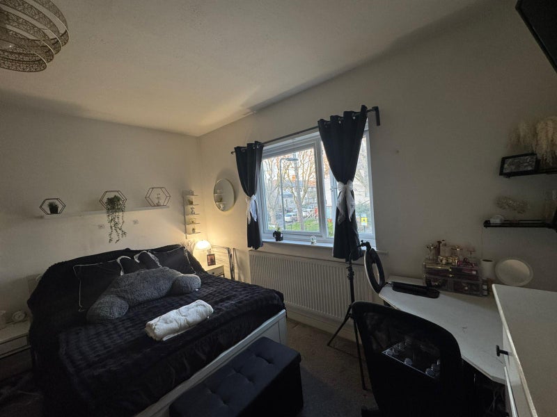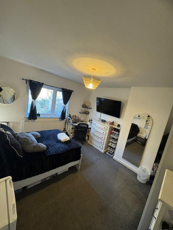 A reasonably large house with lots of space. There is a living room, a kitchen and one bathroom. The rooms available to rent is large, with a wardrobe, it's a double bed and bedside draw.