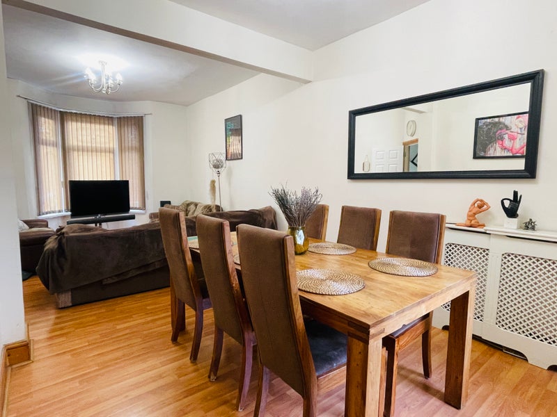 The house offers a spacious open-plan living and dining area on the ground floor, featuring a large table and TV. There is also a modern, fully equipped kitchen with appliances including a washing machine, fridge, toaster, microwave, and boiling water tap.