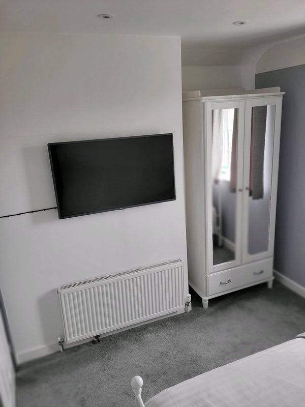 Bedroom is furnished with a TV, wardrobe and a double bed.