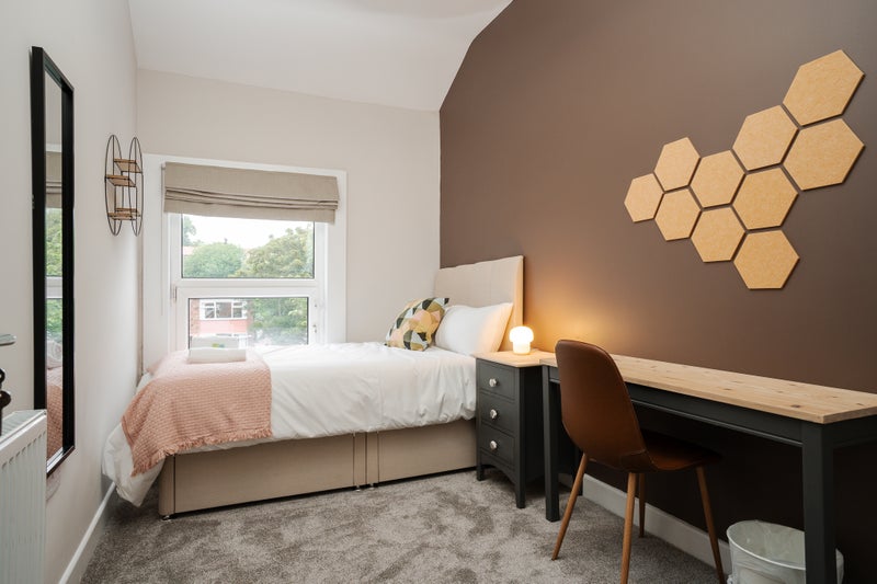 Each room includes a comfy small double bed, generous wardrobe space, desk and chair, drawers, and a full-length mirror – ideal for relaxing or working from home.