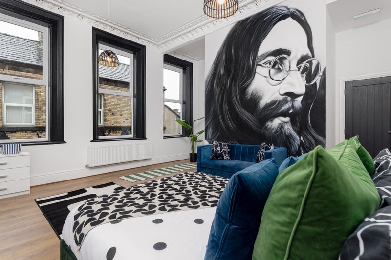 Your room has a double bed, wardrobe, and a chest of drawers. Plus your own en-suite, and access to the outdoor space. There's also separate study places/chill zones throughout the house. There are Beatles themed murals throughout the house to match the interior theme.