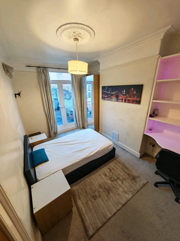 There's a ground floor double bedroom available (see picture) also with a nice corner desk and shelving, mirror door wardrobe and a double bed, also there are french doors leading out into the rear yard area.