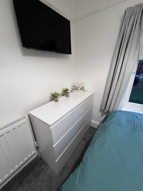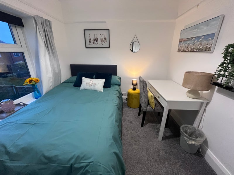 A bright, spacious furnished room in a quiet 4-bedroom semi-detached home. Features a comfortable small double bed, ample storage, and a dedicated desk/study space - perfect for those on placement or studying for exams. Use of private living room and bathroom downstairs.