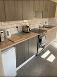 Communal fitted kitchen with, fridge, hob and oven, plenty of cupboard storage, space, dining area.