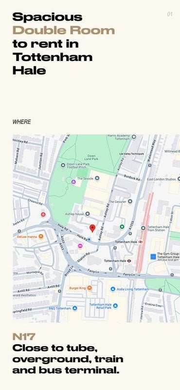 1 minute walk to Tottenham Hale station (15 minutes to KingsCross). Starbucks 1 minute walk.