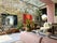 - A large open-plan kitchen and 70s-style sunken living room, with a pink cement wall finish and floor-to-ceiling glass walls that open directly onto a lush tropical garden