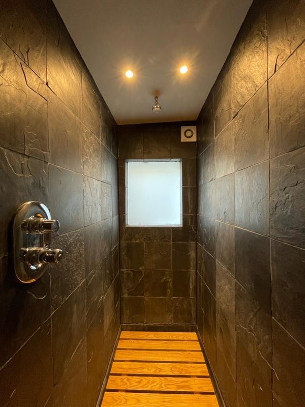 The house itself is large, spread over three floors with two showers and two toilets. There's a decent-sized kitchen and communal living room, with a bright conservatory that opens out onto a small but sunny garden with a large outdoor table.