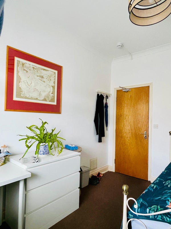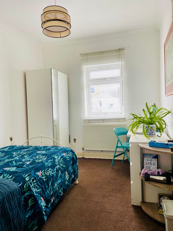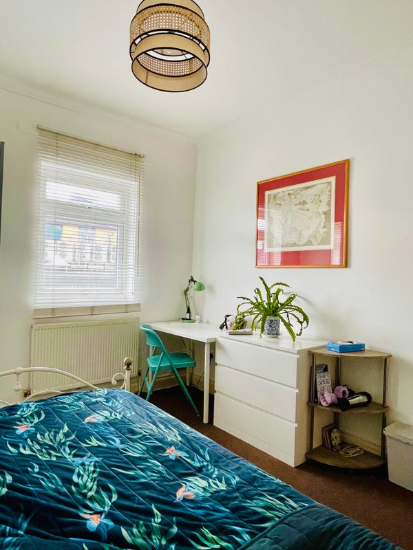 A well-presented, fully furnished small double room available in a quiet and well-maintained house in Walthamstow. The room includes a double bed, an IKEA wardrobe, a chest of drawers, a table and a chair.