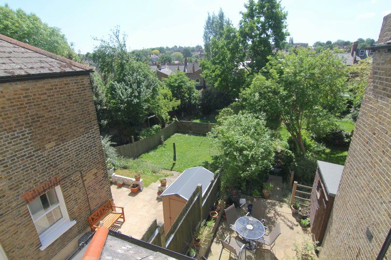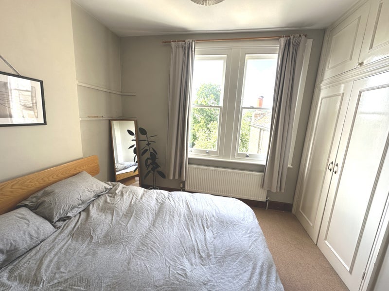 The south-facing bedroom at the rear of the property gets bathed in light in the mornings through equally large sash windows, which overlook some lovely urban greenery. It has a solid oak bed, John Lewis mattress with large storage drawers underneath, and built-in cupboard space for clothes etc.