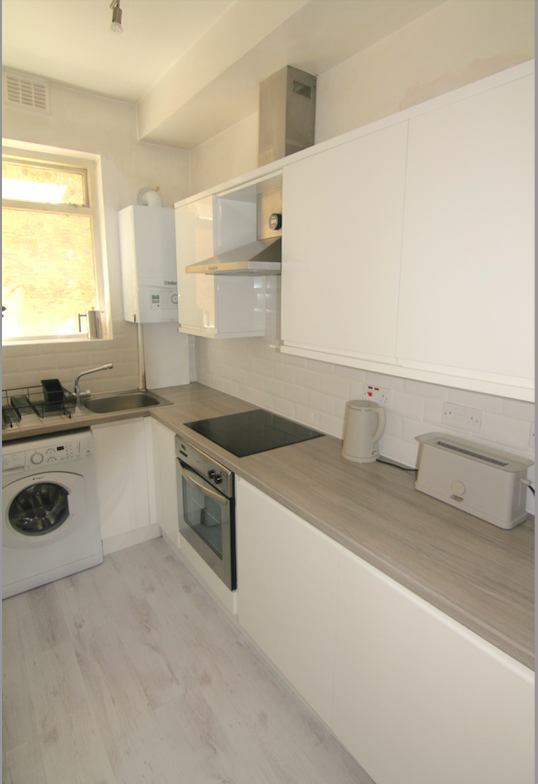 The kitchen is in the middle of the flat and is well kitted out with everything you need, fridge, freezer, toaster, kettle, blender, pots, pans, utensils, etc.