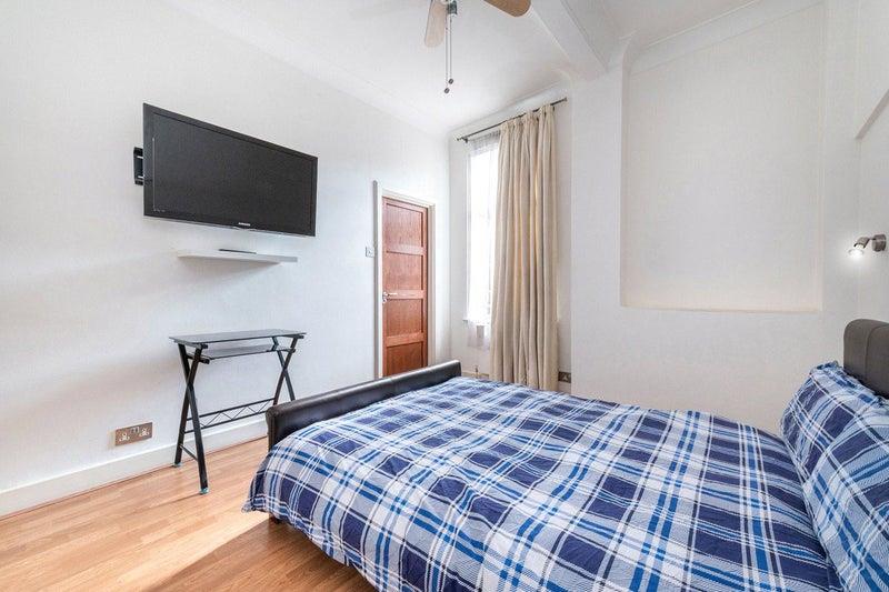 The property offers approximately 650 sq ft of accommodation and comprises a spacious reception room with high ceilings and wood flooring, two well-proportioned double bedrooms, two modern shower rooms, a separate fully fitted kitchen with integrated appliances, and a useful utility room. Large windows allow for good natural light throughout.