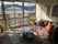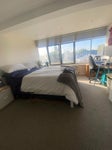The flat is a top-floor duplex apartment in a warehouse conversion, with the room on the upper floor of the duplex. There is an open-plan area on the lower floor and the apartment has loads of natural light with floor-to-ceiling windows.