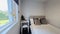 A bright, comfortable double bedroom in a modern flat. The room is fully furnished with a nice window allowing plenty of natural light. It features a double bed, a desk, underfloor heating, and ample storage including an ottoman bed, a wardrobe with chest of drawers.
