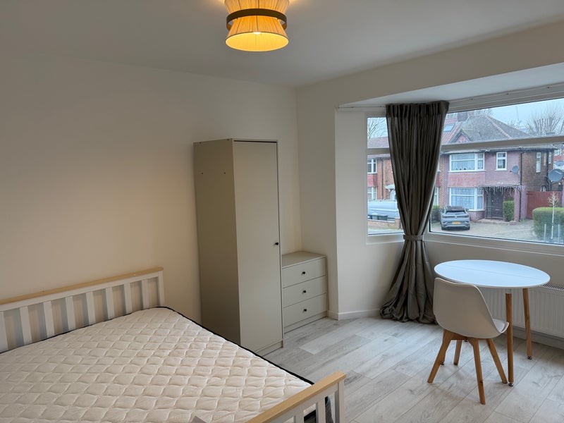 Bright, newly refurbished and fully furnished double room available in a clean, modern house. The room includes a comfortable double bed, wardrobe, chest of drawers, desk, and chair perfect for a working professional or student.