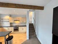 Open-plan kitchen separated by a breakfast bar. Includes hob, oven, new under-counter fridge-freezer and new washing machine.
