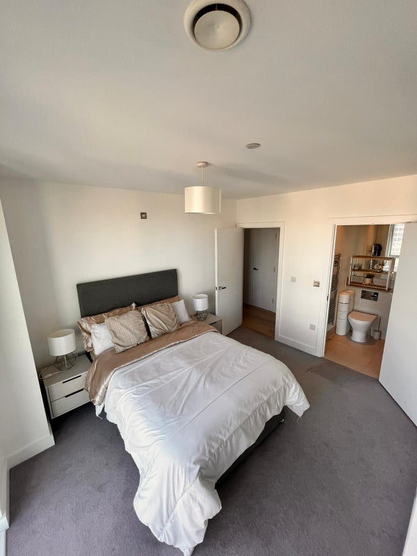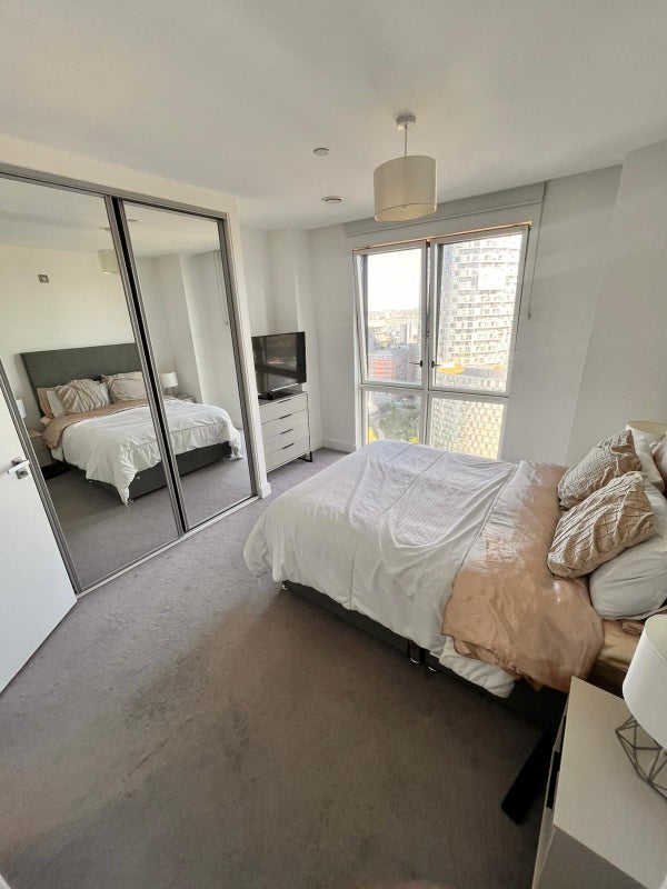 Good-sized ensuite double in a premium 20th-floor flat in Blackwall, E14. It is a corner unit, north of the river, and south-facing with floor-to-ceiling windows. You get the sunrise in the bedroom and the sunset in the lounge, genuinely one of the best things about living here.