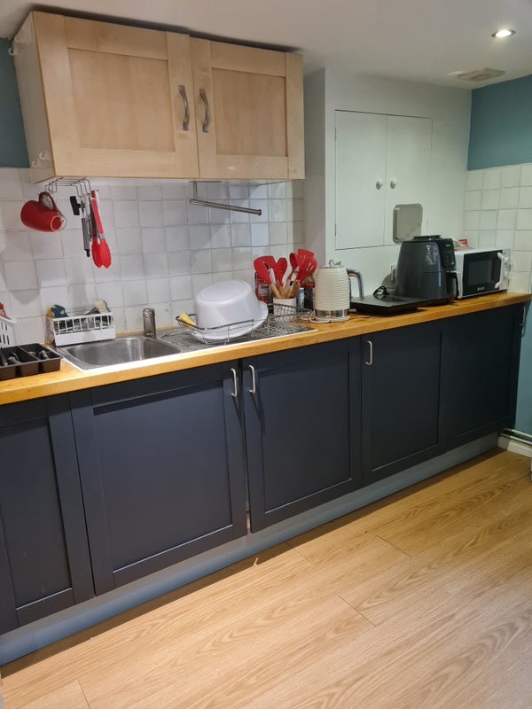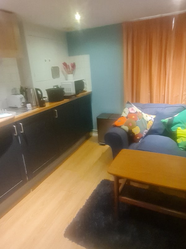 I have a cosy one-bed lower ground floor flat to rent. It includes a spacious bedroom and a living room with kitchenette, plus work station, and a comfortable sofa with large smart TV. Unusually there is a parking space that you can use at no extra charge.