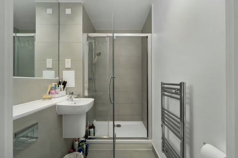 Your private room: A generous double bedroom featuring a king-size bed and an extensive wardrobe. The room includes a private en-suite with a dedicated shower. The layout comfortably accommodates a full-sized desk for those who require a focused workspace.