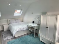 Spacious double en-suite loft room with private kitchen facilities, washing machine and dryer, microwave, fridge etc in a quiet family home. Suitable for single occupancy.