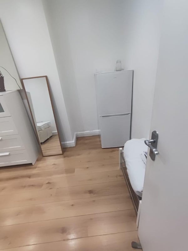 Furnished with a single bed, wardrobe, chest of drawers and fridge
