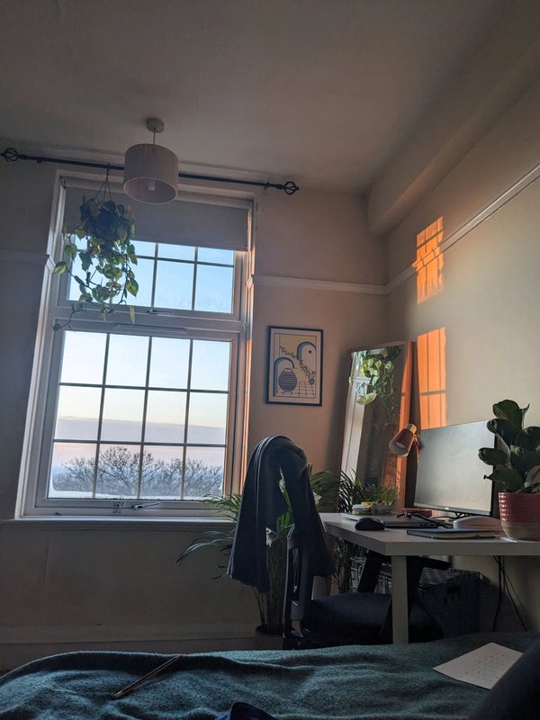 Bright double bedroom available in 3 bed flat in Streatham hill. The bedroom is furnished with a bed, wardrobe, chest of drawers, desk, and large mirror. It gets the afternoon/evening sun and the whole flat has gorg views over West London.
