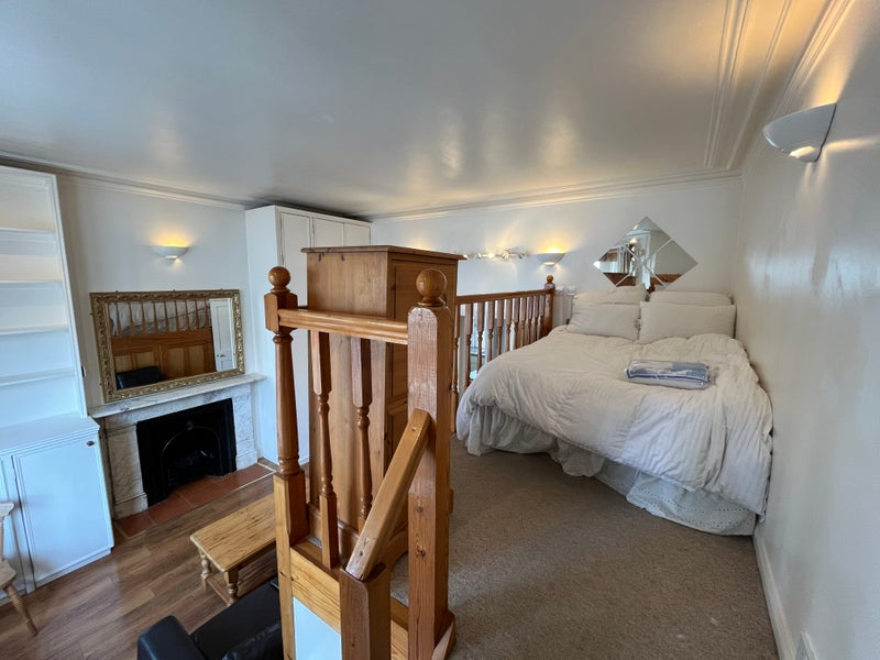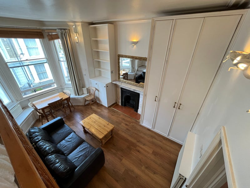 Large character Studio flat with raised pine gallery double bedroom above reception room. Separate kitchen. Modernised to a high standard. Good storage space under gallery. Would appeal to non smoking professional single /couple . Part furnished ie; provide your own sheets, pillows, cutlery, crockery, kitchen items etc… but landlord not to provide portable electrical appliances like lamps, irons, kettles etc..