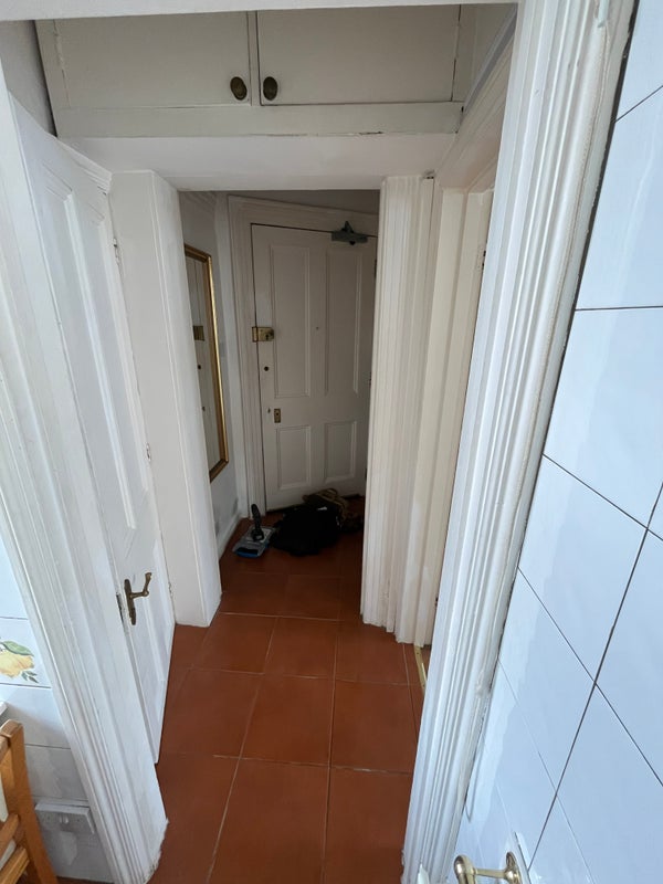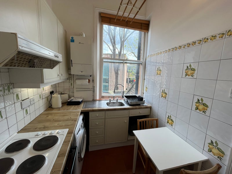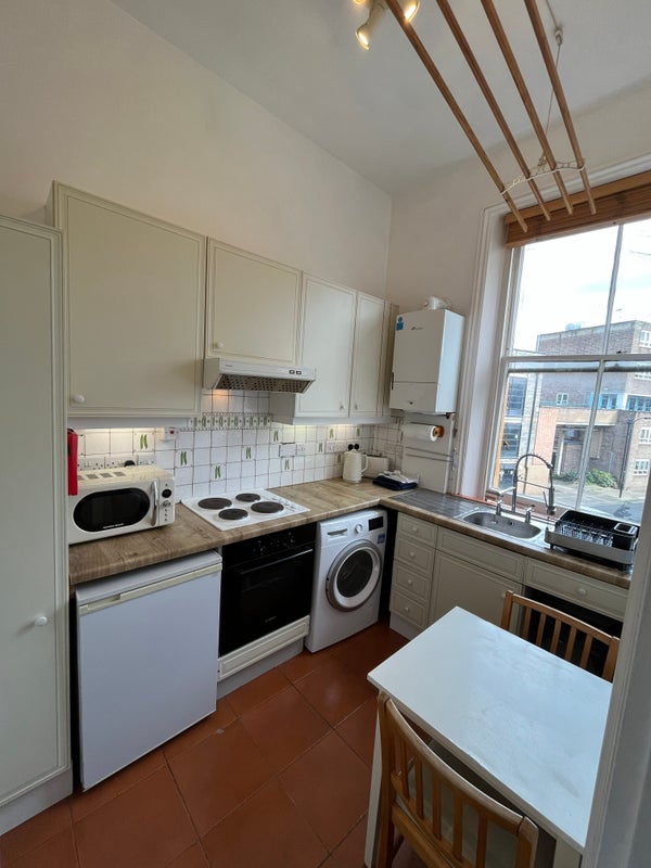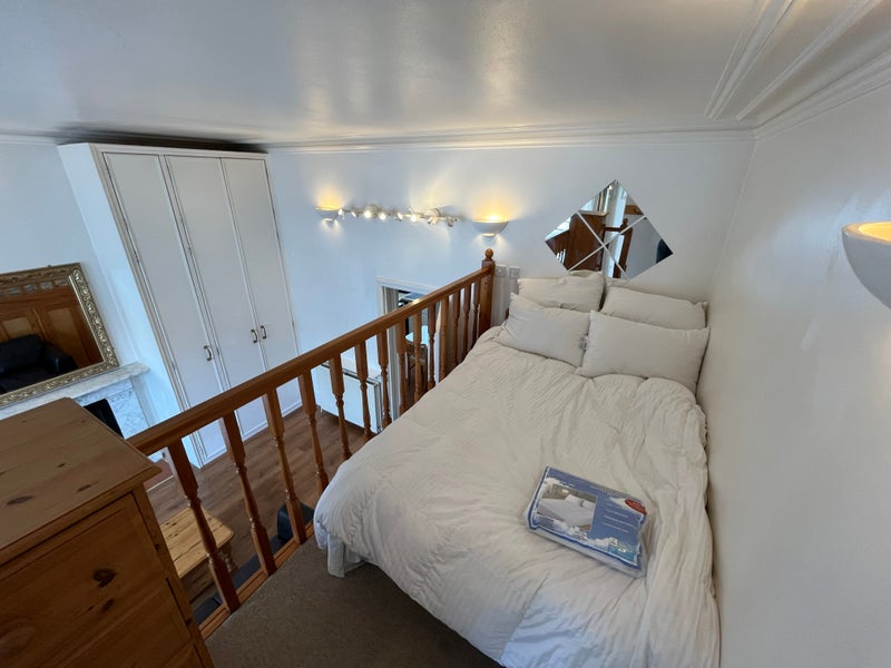 The flat is not a 1 bedroom flat, but a large studio with a raised pine gallery bedroom area and useful storage space below for suitcases & boxes. High ceilings in the building. Large reception room (17. 5 feet by 16 feet). Separate kitchen and bathroom. High specification throughout the flat. Classic but modernised. Clean. (High 11ft ceiling height). Quick Worcester gas combination boiler. Sofa bed as guest bed in reception. There is a large ceiling height cupboard (3 rails high) in the reception with a huge cupboard (11ft by 5ft by 4ft high). There is a high pressure thermostatically controlled shower. Video entry phone system.