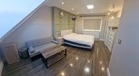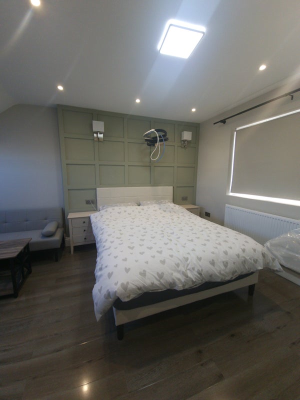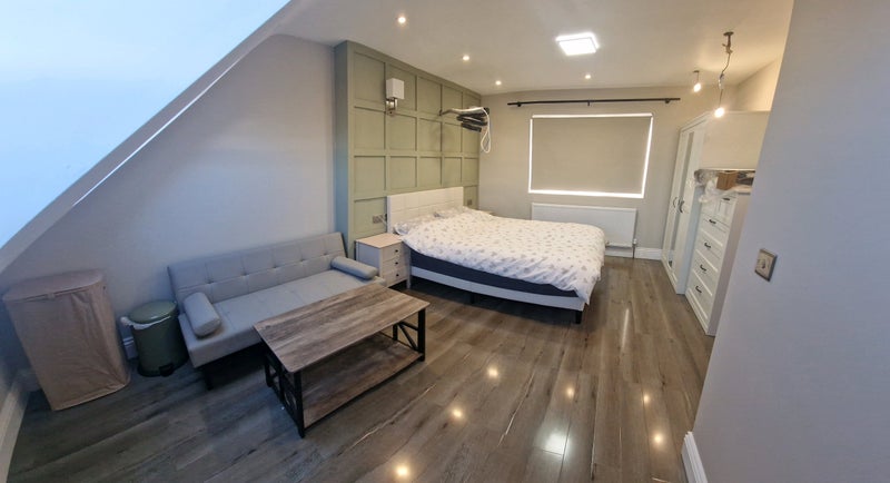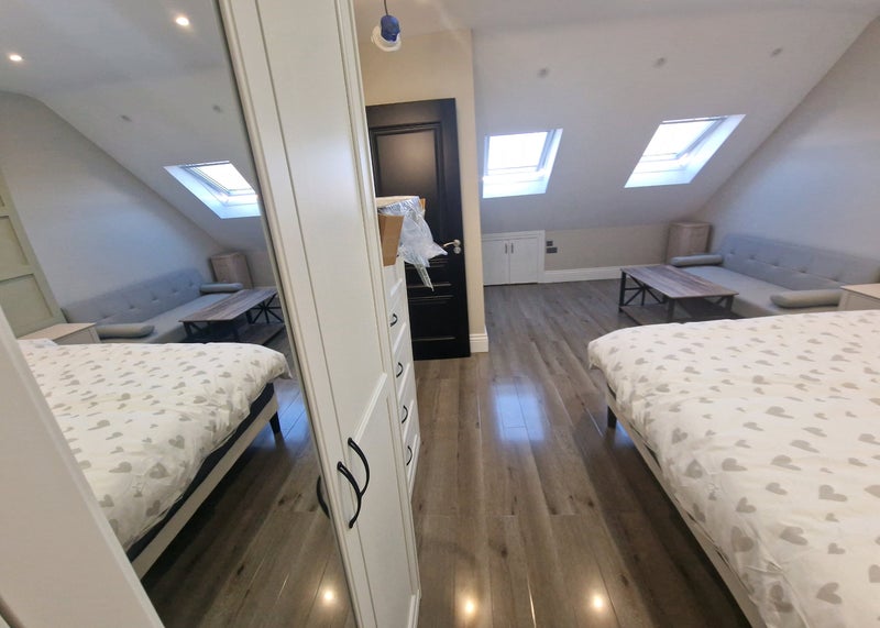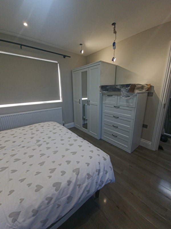 The room is fully furnished with a large triple wardrobe (including a full-length mirror) and a matching tall chest of drawers for ample storage. All the furniture including the mattress is brand new.