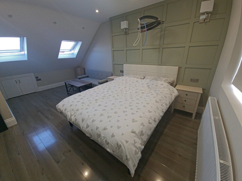 The room is located on the top floor for extra privacy. Enjoy a bright and stylish bedroom featuring a gorgeous sage green feature wall with bespoke wood paneling. The room is thoughtfully zoned, offering a comfortable sleeping area and a separate integrated seating nook with a sofa and coffee table—perfect for relaxing or working from home.