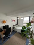 The room comes furnished with the bed and mattress, a small chest of drawers in the cupboard + rail and shelves. All the personal belongings in the room and wardrobe will be cleared before move in.