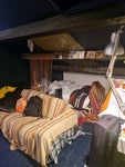 The current resident has the room set up for a double bed, clothes rack, a sofa, and a work area. This warehouse is DIY-friendly and each of us decorates our own rooms.