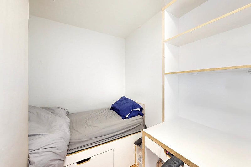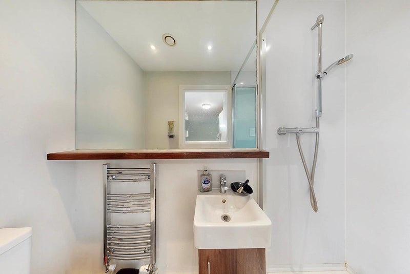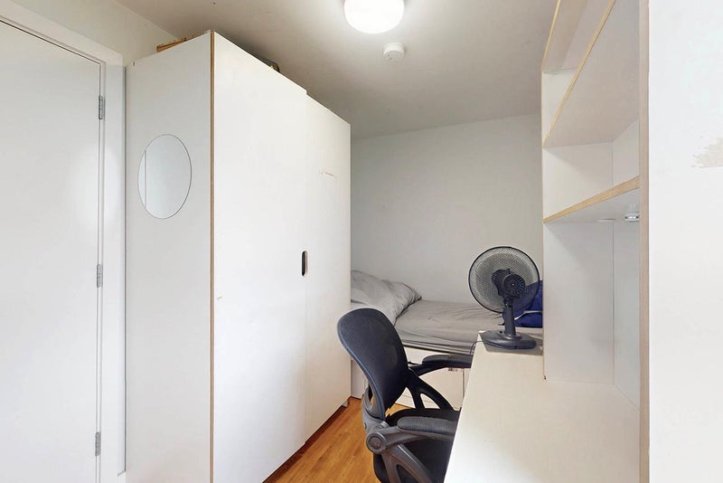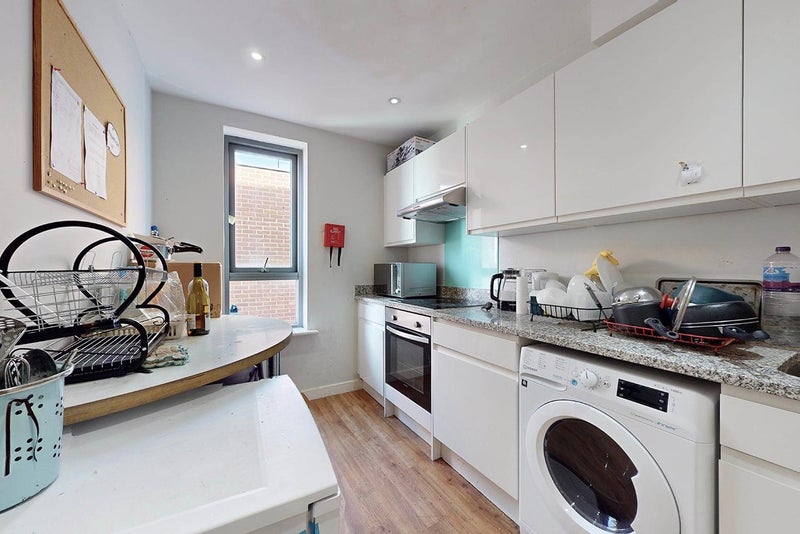 Single ensuite room furnished with a single bed, desk, wardrobe, mini fridge and ample shelving space. Modern bathroom with large mirror, shelf and under-sink storage space. Shared kitchen with 4 other flatmates.